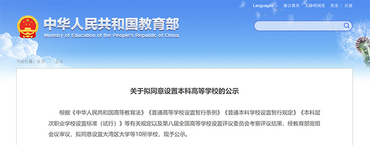 6月11日,教育部发布《关于拟同意设置本科高等学校的公示》,拟同意设置大湾区大学、宁波东方理工大学等10所学校。
