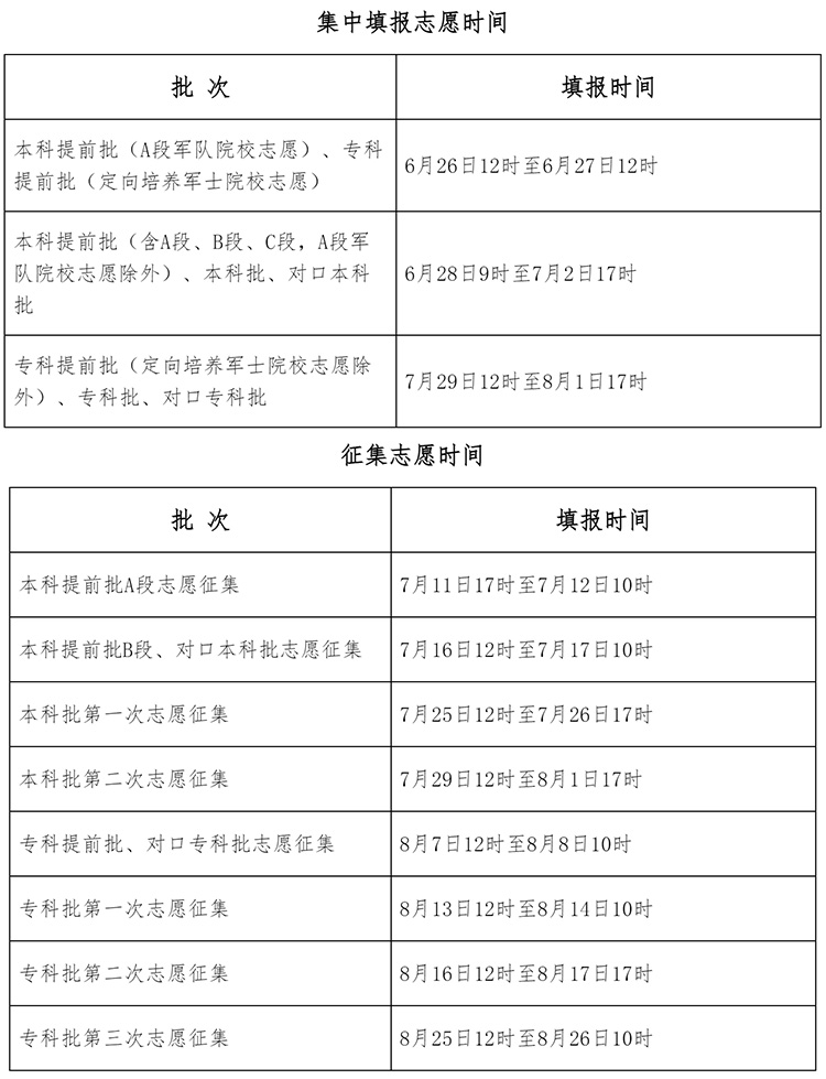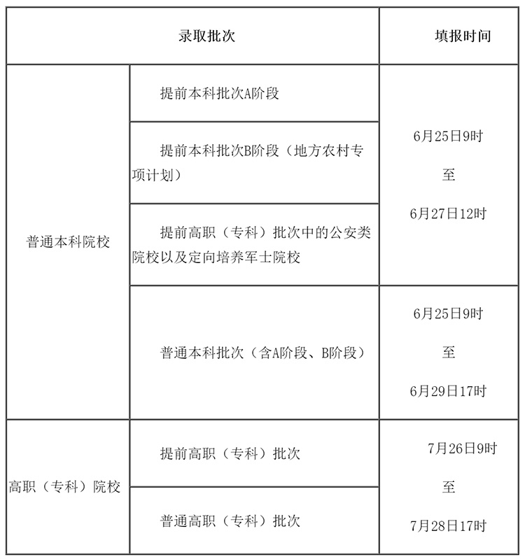6月25日至30日:填报本科提前批(A、B 段)、本科批(A、B 段)志愿、高职(专科)提前批(A、B、C 段)志愿。