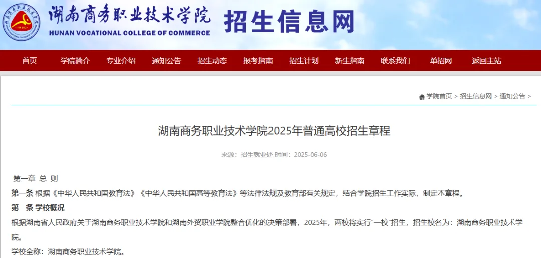 同一日,湖南商务职业技术学院也发布2025年普通高校招生章程,根据湖南省人民政府关于湖南商务职业技术学院和湖南外贸职业学院整合优化的决策部署,2025年,两校将实行“一校”招生,招生校名为:湖南商务职业技术学院。办学类型为公办全日制普通高等职业教育(三年)。
