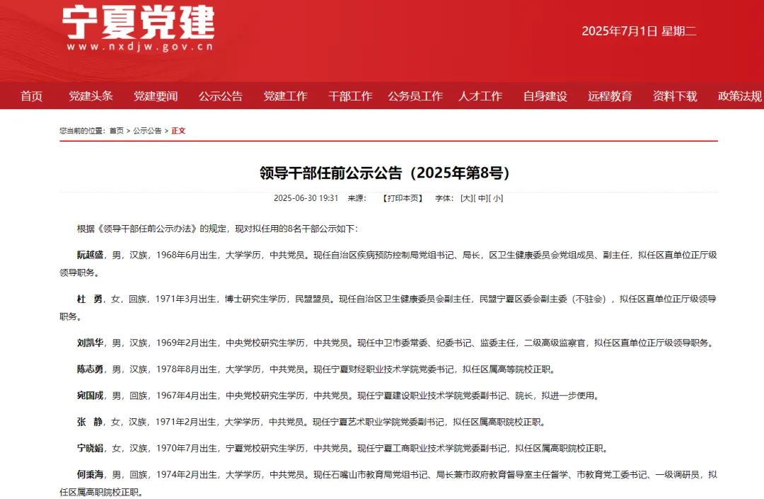 6月30日,中共宁夏区委组织部发布《领导干部任前公示公告》(2025年第8号),涉及宁夏多所院校的领导班子调整。