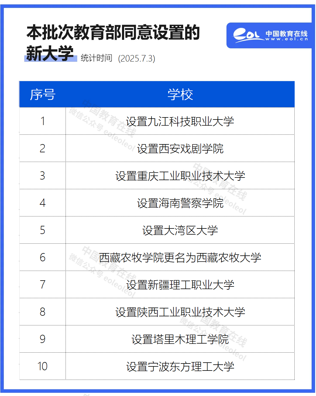近日,教育部发布《教育部关于同意设置宁波东方理工大学的函》、《教育部关于同意西藏农牧学院更名为西藏农牧大学》的函等10个函件,同意设置宁波东方理工大学、大湾区大学等10所新大学。