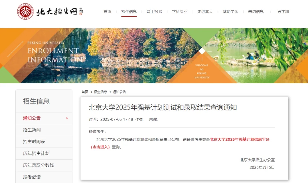 北京大学2025年强基计划测试和录取结果已公布,考生可登录北京大学2025年强基计划信息平台查询。