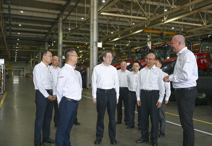 7月7日至9日,中共中央政治局常委、国务院副总理丁薛祥在黑龙江、吉林调研。这是7月7日,丁薛祥在凯斯纽荷兰工业(哈尔滨)机械有限公司调研。新华社记者 张领 摄