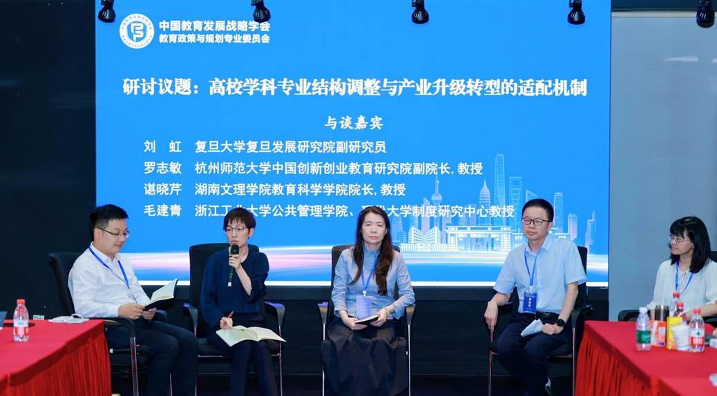 随后的圆桌研讨环节,专委会学术委员、复旦大学复旦发展研究院副研究员刘虹,杭州师范大学中国创新创业教育研究院副院长罗志敏,湖南文理学院教育科学学院院长谌晓芹,浙江工业大学现代大学制度研究中心教授毛建青就“高校学科专业设置调整与产业结构升级适配机制”议题做分享。
