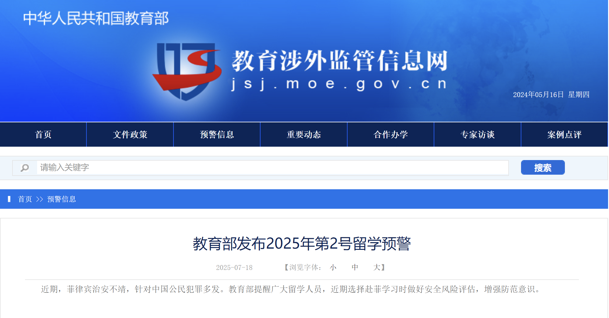 教育部发布2025年第2号留学预警:赴菲学习时做好安全风险评估