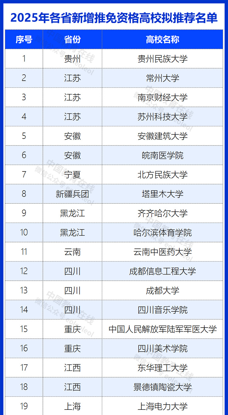 近日,多地教育厅官网公示2025年新增推免资格高校拟推荐名单。据不完全统计,截至7月29日,已有20个省市44所高校拟推荐为新增推免资格高校。