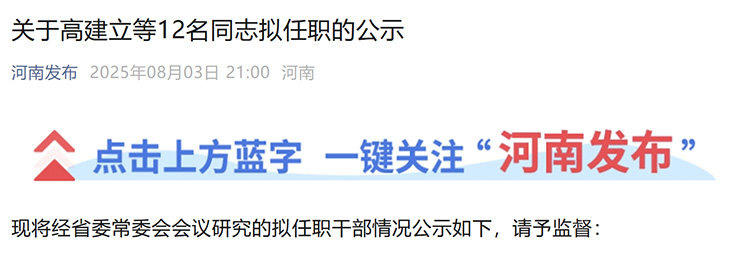 8月3日,中共河南省委组织部发布《关于高建立等12名同志拟任职的公示》,其中涉及多所高校。