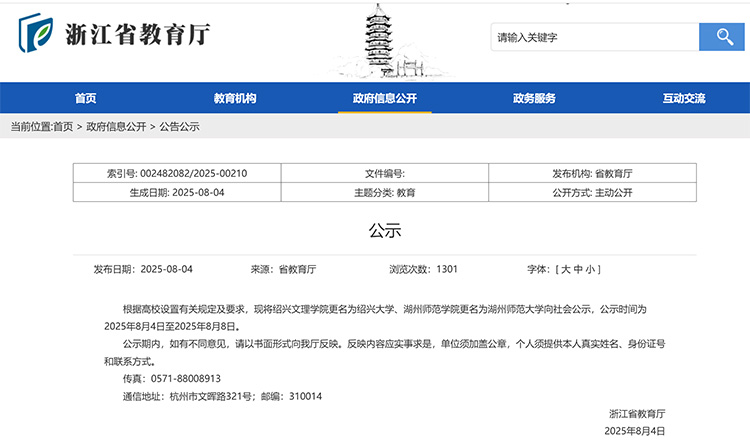 近日,浙江省教育厅发布公示,根据高校设置有关规定及要求,现将绍兴文理学院更名为绍兴大学、湖州师范学院更名为湖州师范大学向社会公示,公示时间为2025年8月4日至2025年8月8日。