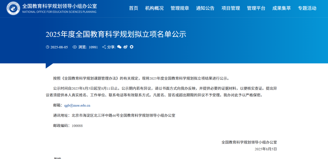 8月5日,全国教育科学规划领导小组办公室发布《2025年度全国教育科学规划拟立项名单公示》。共540项个项目拟获立项资助。