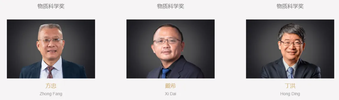 “物质科学奖”获奖者方忠、戴希、丁洪,表彰他们在拓扑电子材料的计算预测以及实验实现方面做出的贡献。
