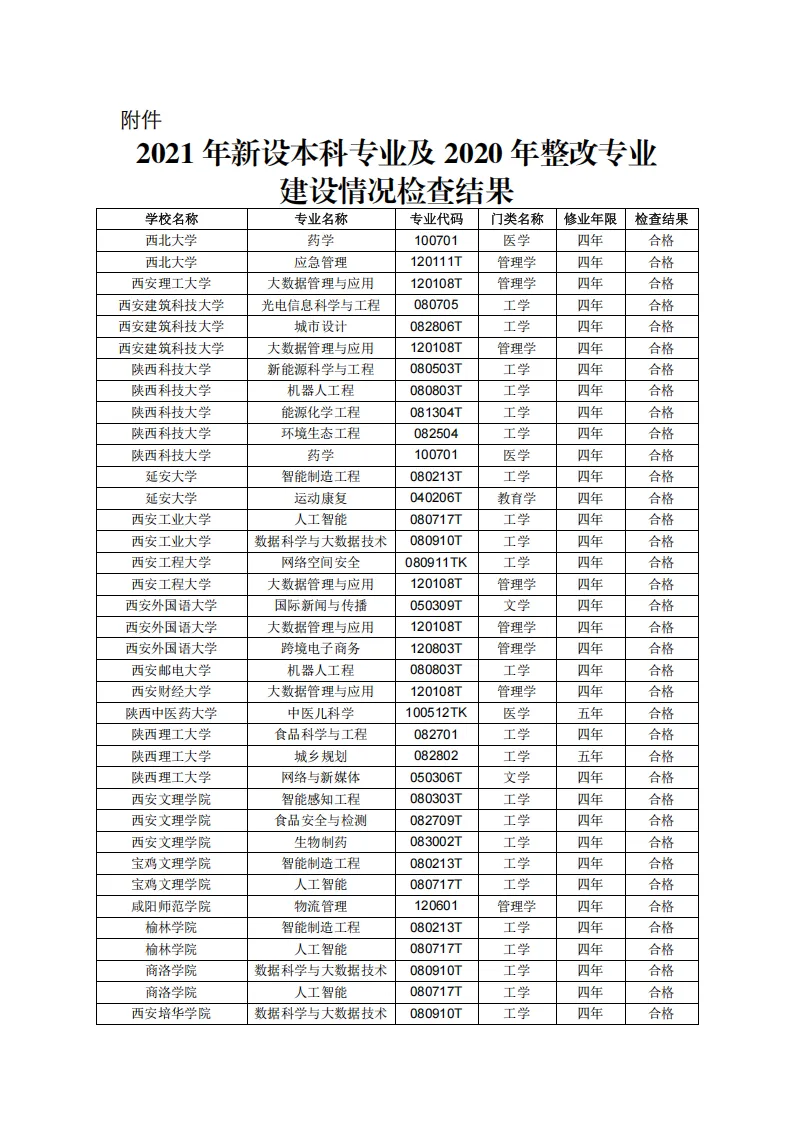 8月5日,陕西省教育厅发布《关于2021年新设本科专业及2020年整改专业建设情况检查结果的公示》。