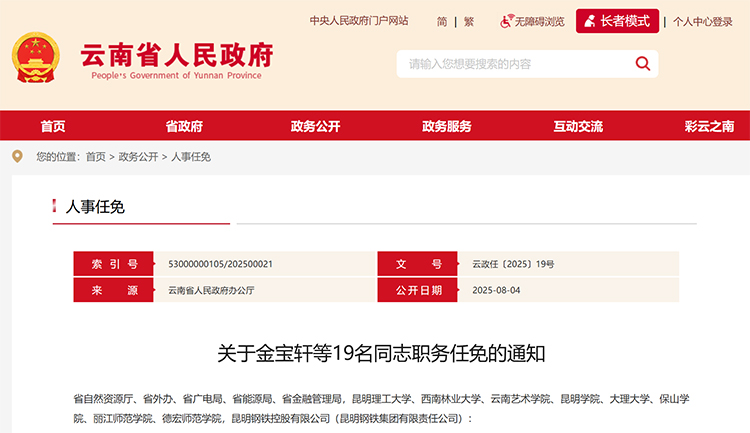 近日,云南省人民政府发布《关于金宝轩等19名同志职务任免的通知》,其中涉及昆明理工大学、西南林业大学、云南艺术学院、昆明学院、大理大学、保山学院、丽江师范学院、德宏师范学院等多所高校。