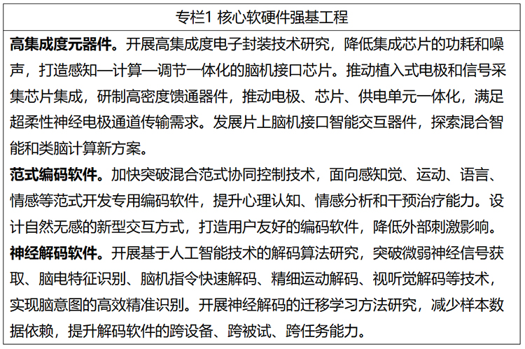 (二)突破关键脑机芯片。发展高通道、高速率脑信号采集芯片,强化模数转换、通道管理和噪声抑制,增强脑信号采集放大能力。研发高性能、超低功耗脑信号处理芯片,强化并行处理能力,推动感知、计算和调节等功能的一体化集成。研发超低功耗、高速率、高可靠的通信芯片,提升脑信号传输和抗干扰能力。