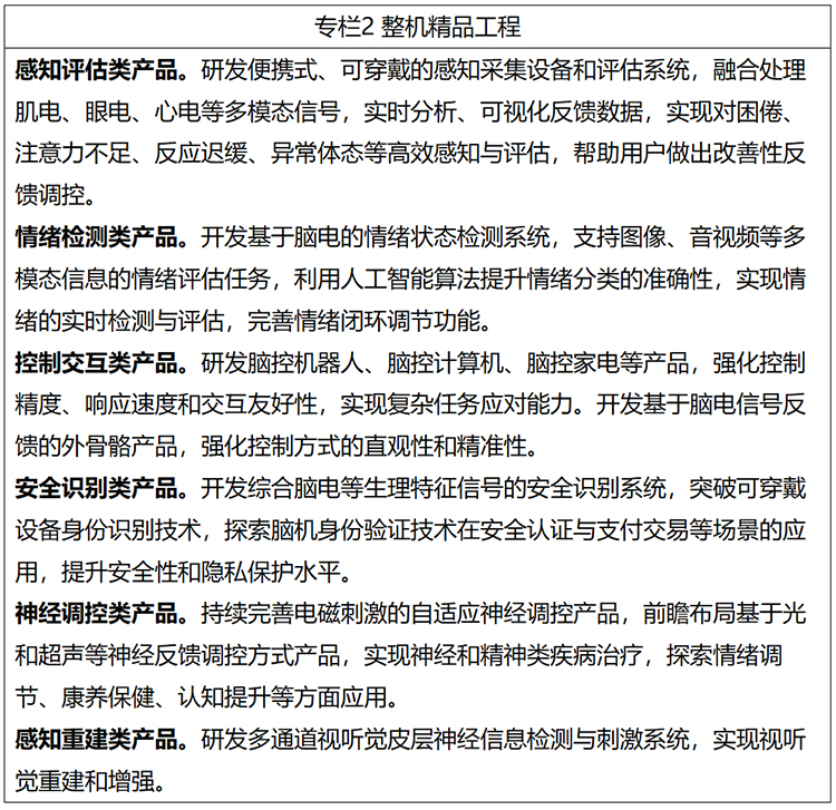 (六)发展辅助设备。研发辅助生理信号设备,通过脑信号与肌电、眼电、心电、近红外等多模态信号的融合,提升交互控制和感知觉评估的精准度。研发用于植入脑机接口的高精度手术机器人,突破亚微米级精度控制与动态调整技术,提升区域精准实时成像与三维重建能力。