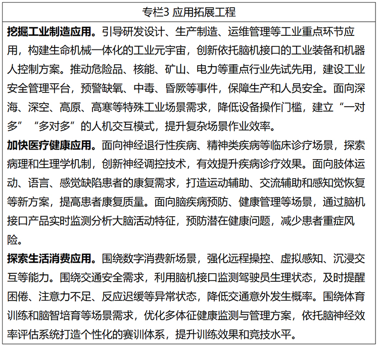 加快医疗健康应用。面向神经退行性疾病、精神类疾病等临床诊疗场景,探索病理和生理学机制,创新神经调控技术,有效提升疾病诊疗效果。面向肢体运动、语言、感觉缺陷患者的康复需求,打造运动辅助、交流辅助和感知觉恢复等新方案,提高患者康复质量。面向脑疾病预防、健康管理等场景,通过脑机接口产品实时监测分析大脑活动特征,预防潜在健康问题,减少患者重症风险。