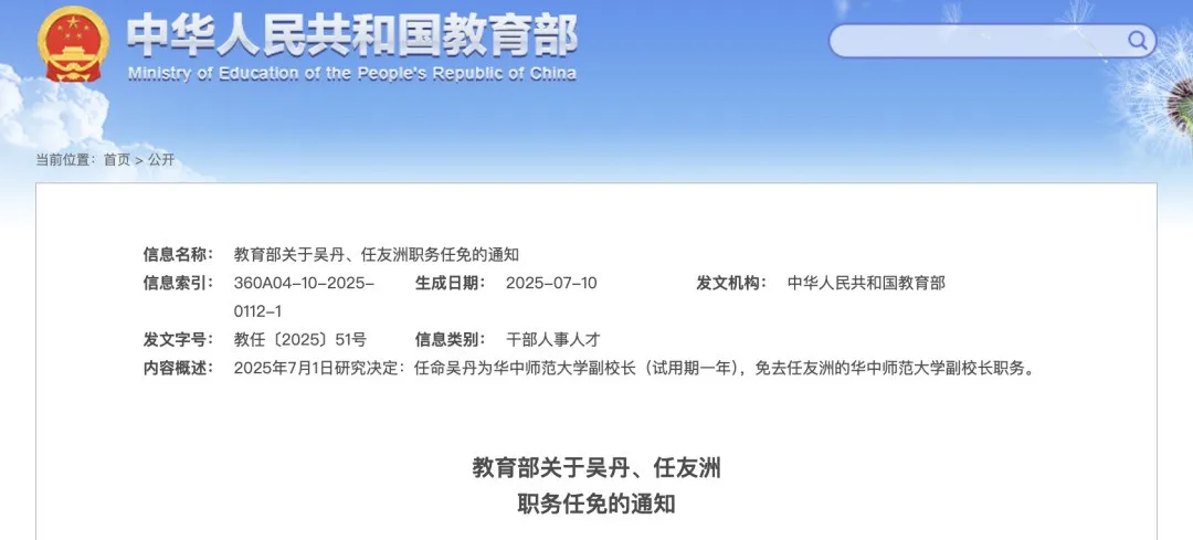 8月6日,教育部网站发布多条任免通知,其中涉及武汉理工大学、华中师范大学领导班子调整。