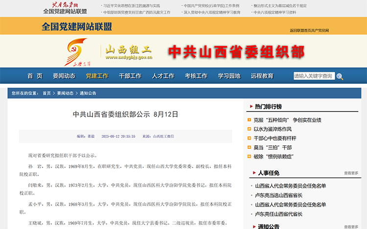 8月12日,山西省委组织部发布一则省委研究拟任职干部公示信息。