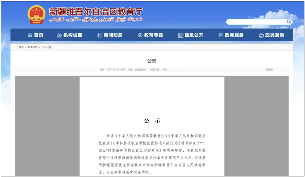8月18日,新疆维吾尔自治区教育厅发布公示,根据《中华人民共和国高等教育法》《中华人民共和国职业教育法》《本科层次职业学校设置标准(试行)》《教育部关于“十四五”时期高等学校设置工作的意见》等有关规定,现就拟向教育部申报设置新疆能源铁道职业技术大学事项予以公示。