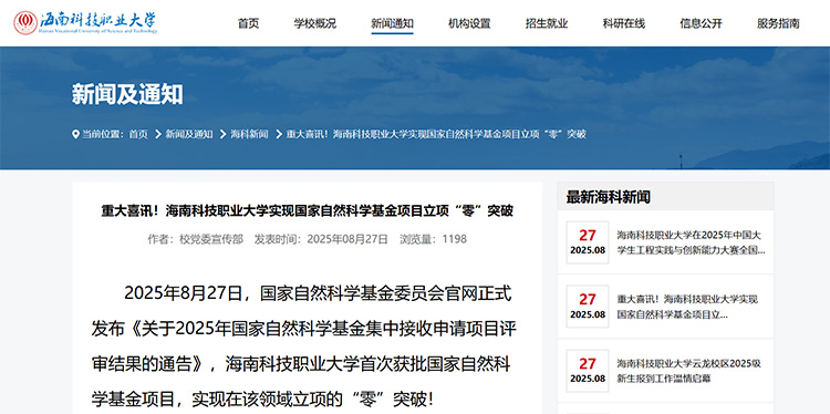 8月27日,国家自然科学基金委员会公布2025年国家自然科学基金集中接收申请项目评审结果。据不完全统计,目前已有海南科技职业大学、重庆电子科技职业大学、重庆工程职业技术学院、铜仁职业技术大学、湖南汽车工程职业大学、深圳信息职业技术学院、厦门海洋职业技术学院等高职院校公布获资助项目情况,多所学校获历史性突破。