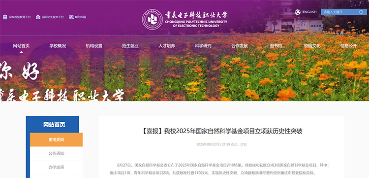 重庆电子科技职业大学成功获批立项3项国家自然科学基金项目,其中:面上项目1项,青年科学基金项目2项,共获批准经费110万元,实现历史性突破,立项数和批准经费位列重庆市职业院校首位。
