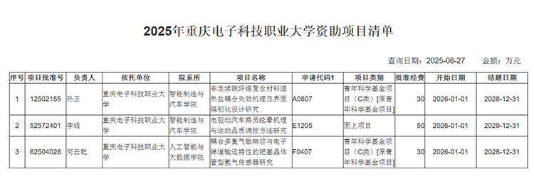 重庆工程职业技术学院成功获批立项3项国家自然科学基金项目,实现历史突破,立项数量位列重庆市高职院校首位。