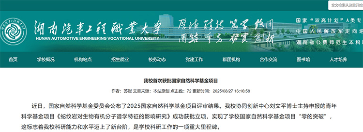 湖南汽车工程职业大学协同创新中心博士刘文平主持申报的青年科学基金项目《蛇纹岩对生物有机分子谱学特征的影响研究》成功获批立项,实现了该校国家自然科学基金项目“零的突破”。这标志着湖南汽车工程职业大学科研能力和水平迈上了新台阶,是该校科研工作的一项重大里程碑。