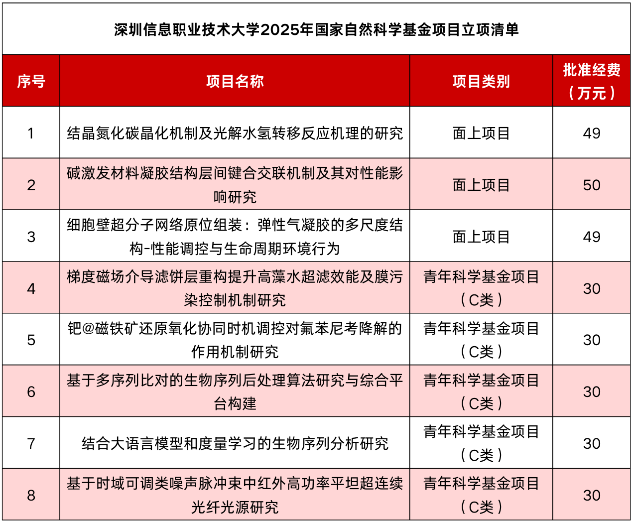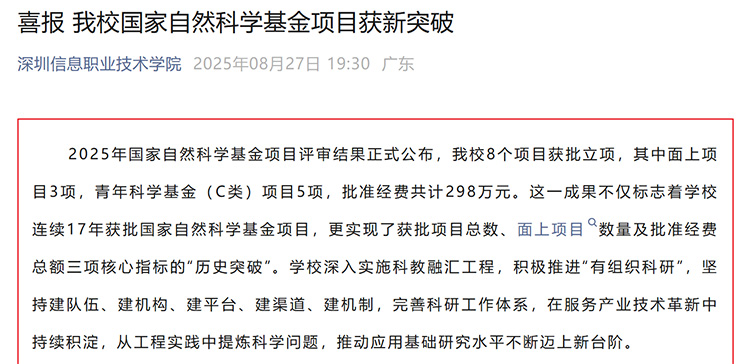 2025年国家自然科学基金项目评审结果正式公布,深圳信息职业技术学院8个项目获批立项,其中面上项目3项,青年科学基金(C类)项目5项,批准经费共计298万元。这一成果不仅标志着学校连续17年获批国家自然科学基金项目,更实现了获批项目总数、面上项目数量及批准经费总额三项核心指标的“历史突破”。学校深入实施科教融汇工程,积极推进“有组织科研”,坚持建队伍、建机构、建平台、建渠道、建机制,完善科研工作体系,在服务产业技术革新中持续积淀,从工程实践中提炼科学问题,推动应用基础研究水平不断迈上新台阶。