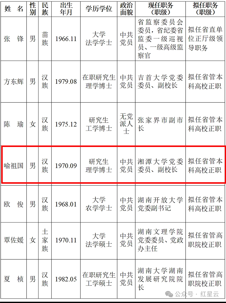 8月28日,湖南省委组织部发布省委管理干部任前公示公告。公告显示:湘潭大学党委委员、副校长喻祖国,拟任省管本科高校正职。
