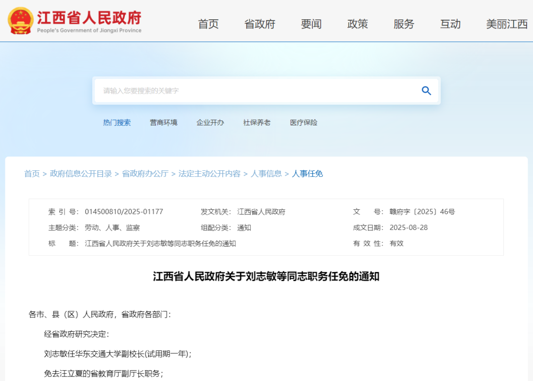 8月28日,江西省人民政府发布一批领导干部任免的通知,其中,刘志敏任华东交通大学副校长(试用期一年)。