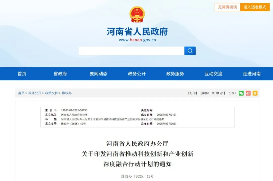 9月6日,河南省人民政府办公厅印发《河南省推动科技创新和产业创新深度融合行动计划》。