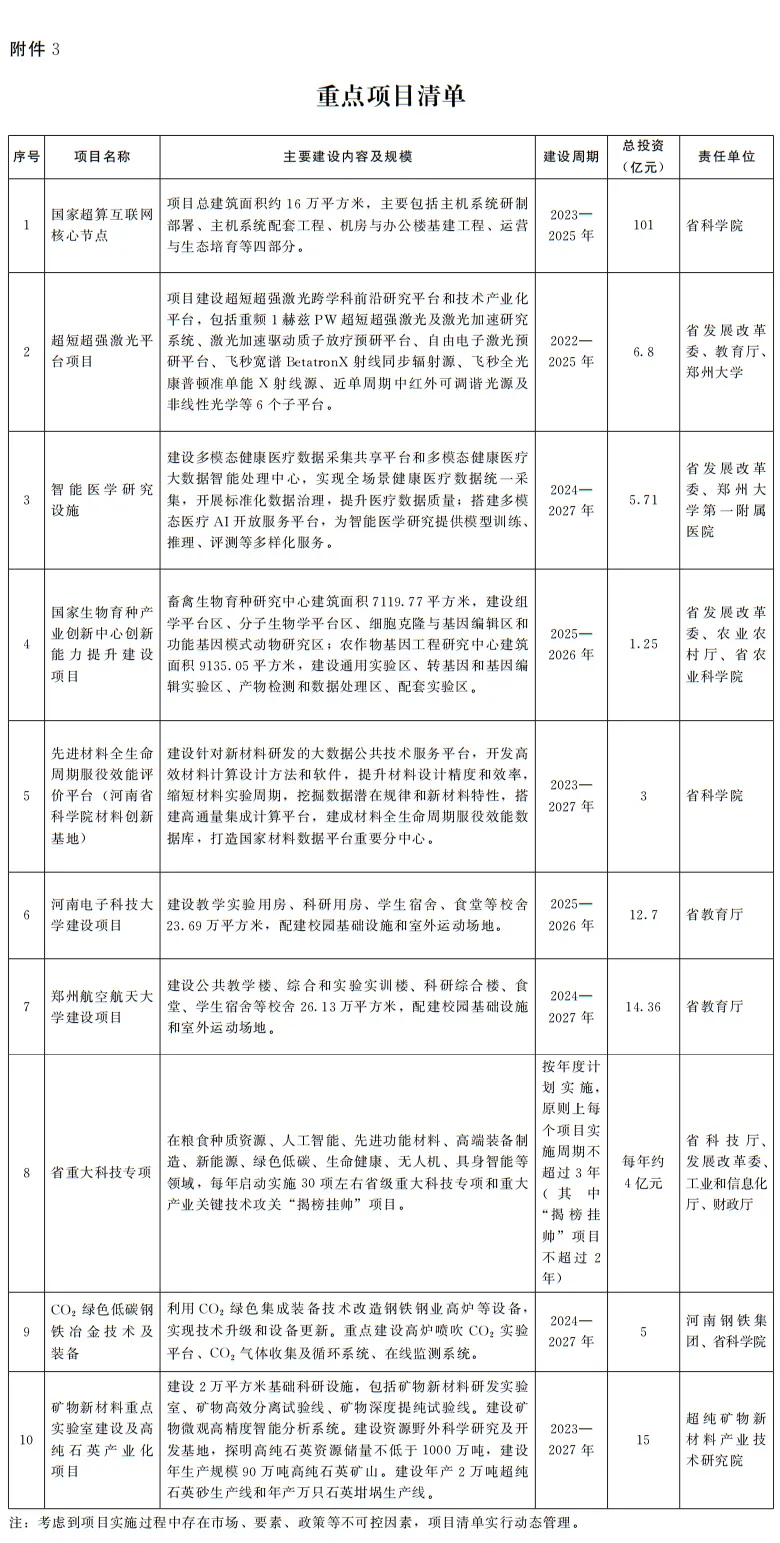 其中提到:推进高等教育扩优提质。加快“双一流”高校建设,动态调整“双一流”高校创建范围,争取更多高校和学科进入“双一流”建设范围。争取国外高水平理工类大学来豫合作办学,探索建设高水平新型研究型大学。深化郑州大学部省合建,新增1—2所高校进入省部共建序列。紧密对接全省重点产业发展需求,稳步增加应用型本科和职业本科高校数量,持续优化本科高校区域布局,努力实现本科高校省辖市全覆盖。积极吸引省外高校在豫设立研究院。推动全省国家大学科技园优化重塑。