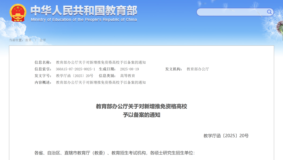 9月12日,教育部办公厅发布《关于对新增推免资格高校予以备案的通知》。