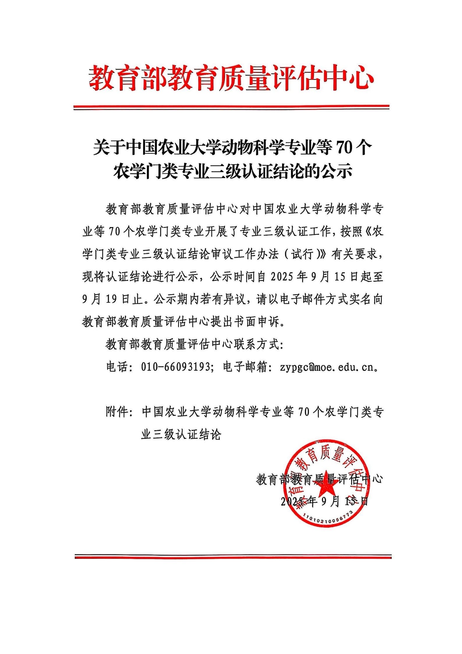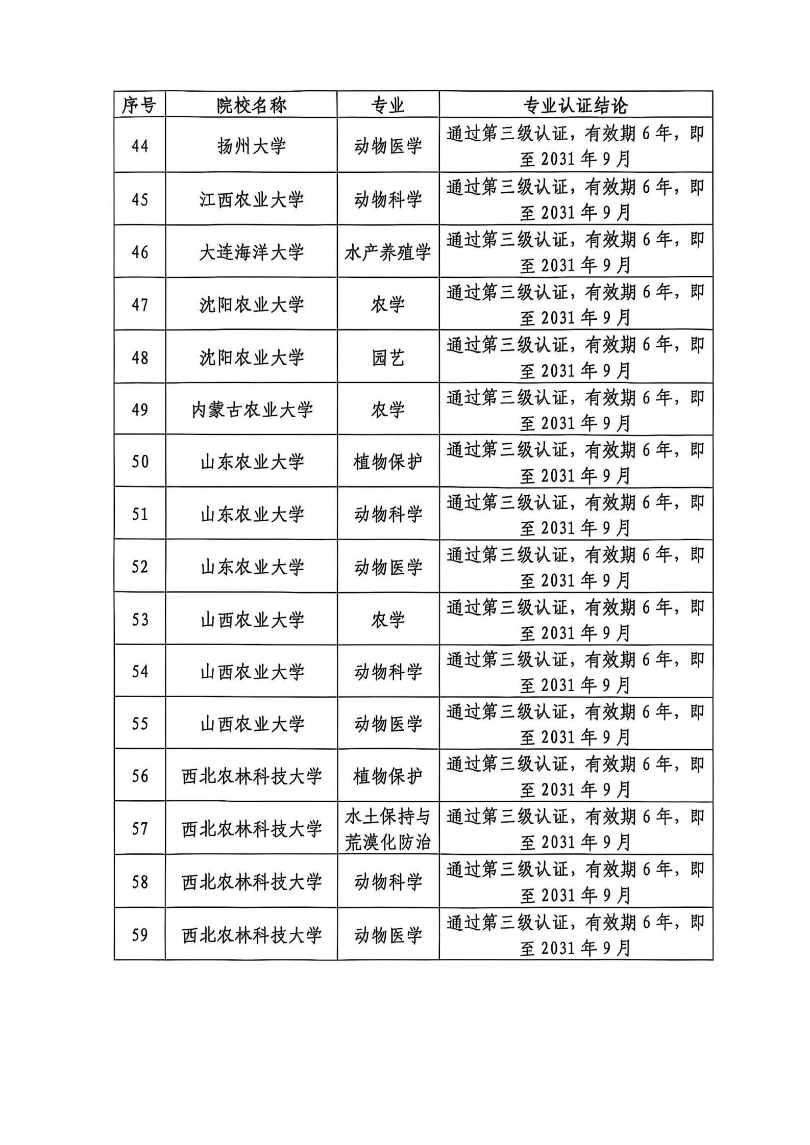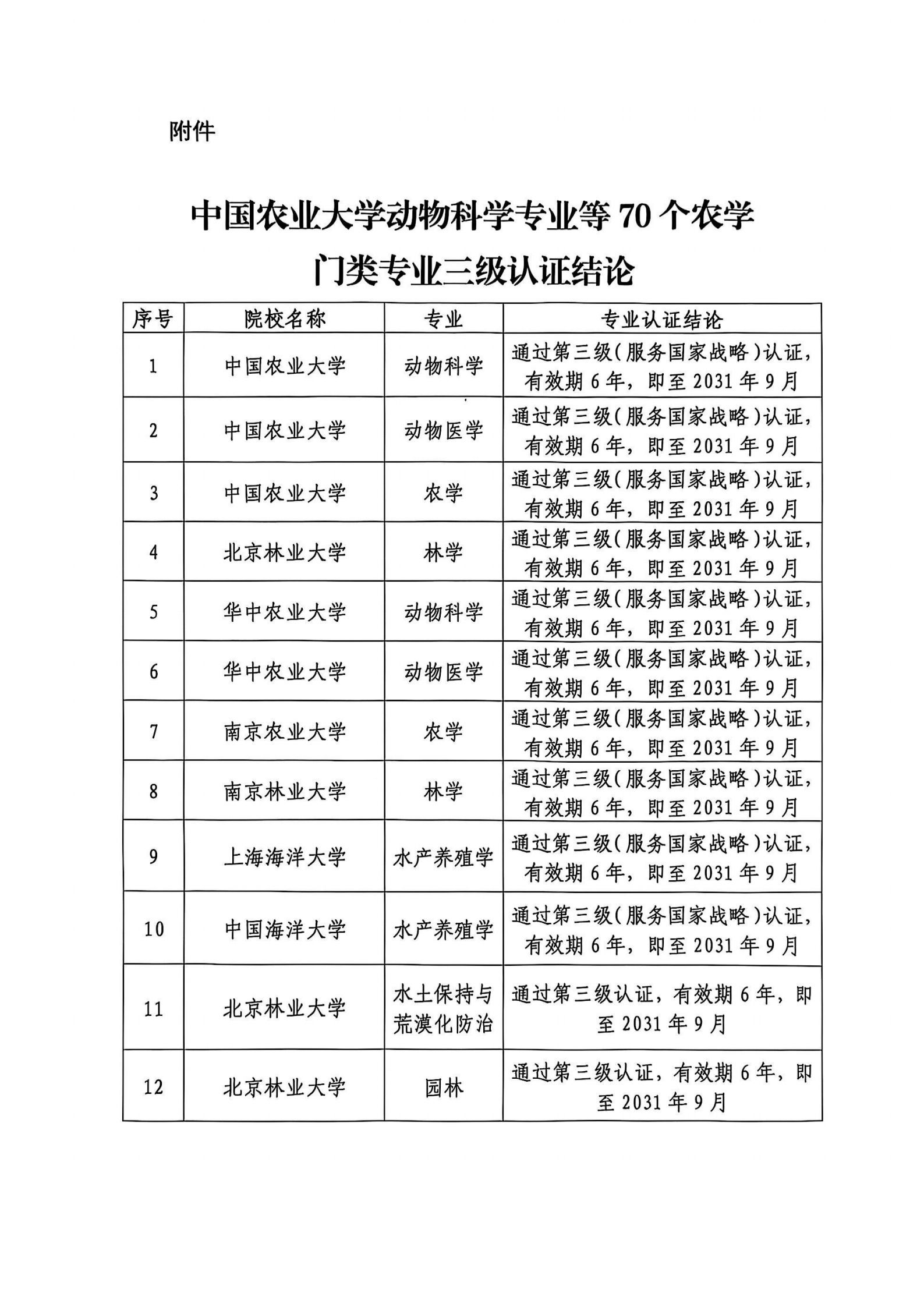 中国农业大学动物科学专业等70个农学门类专业拟通过三级认证