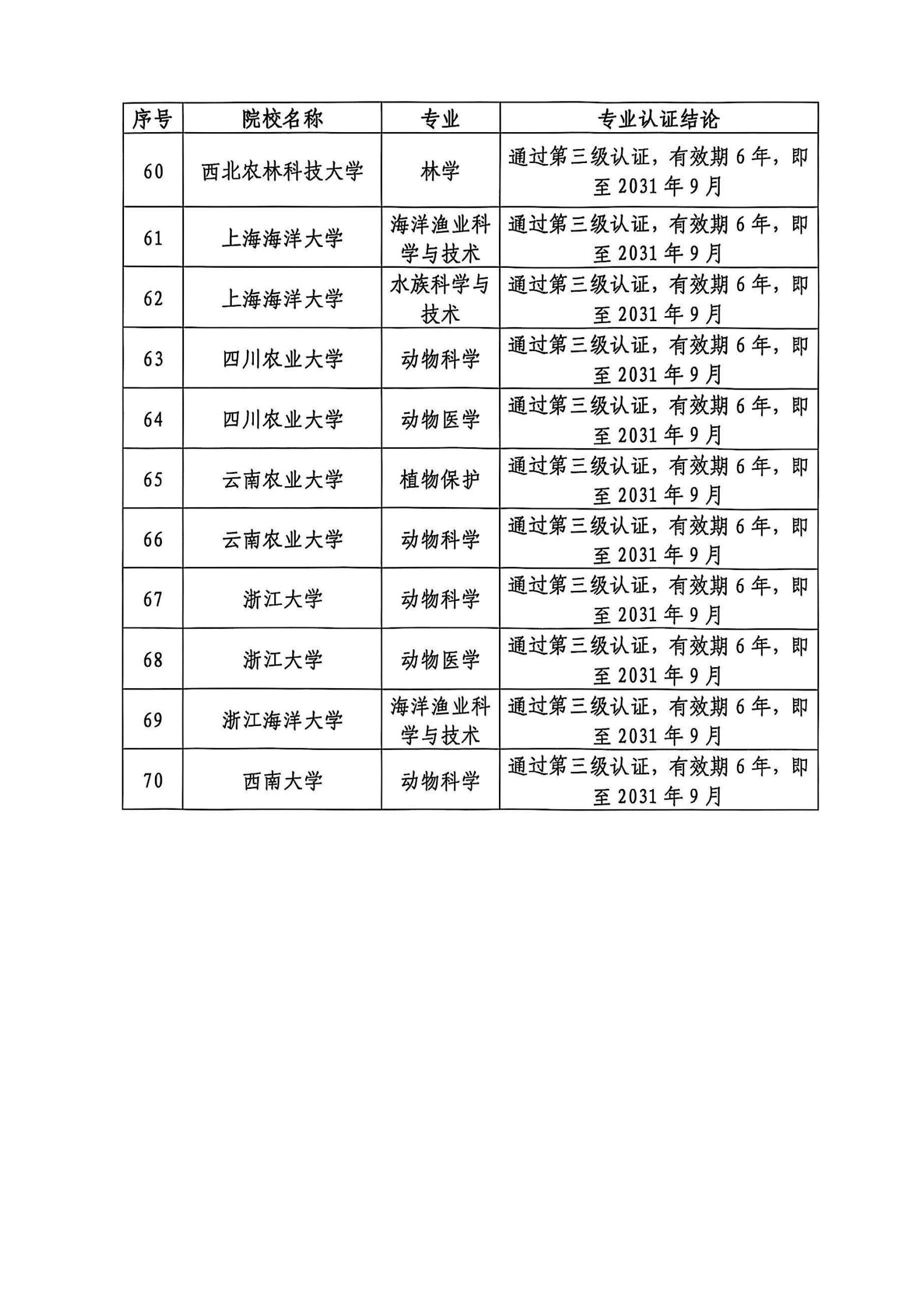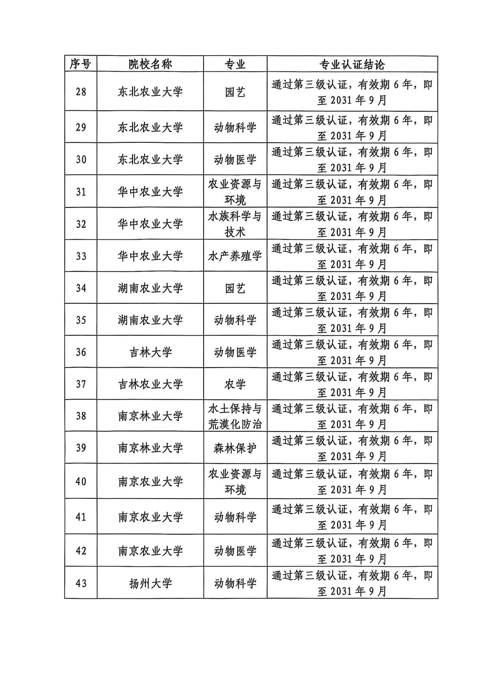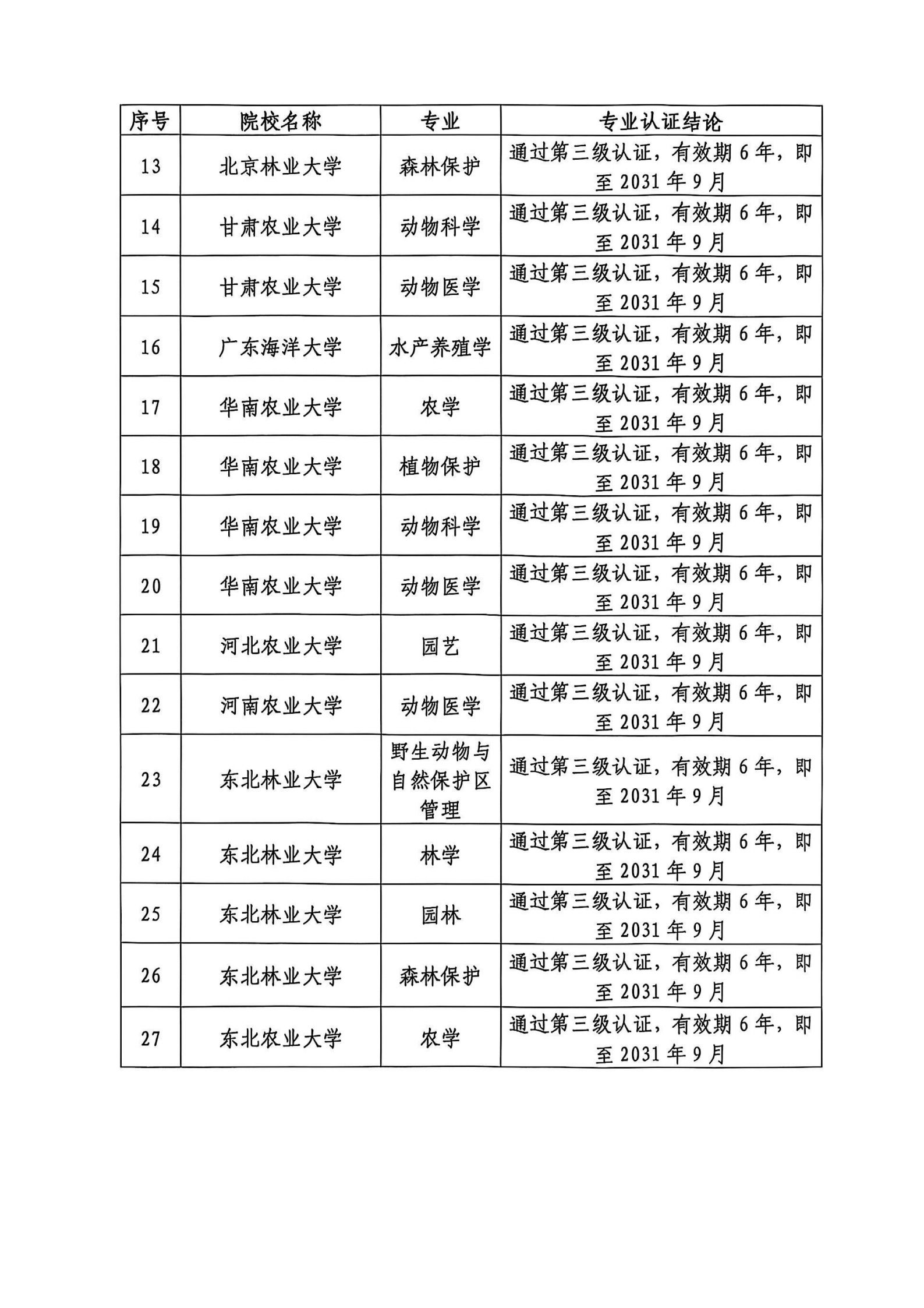 中国农业大学动物科学专业等70个农学门类专业拟通过三级认证
