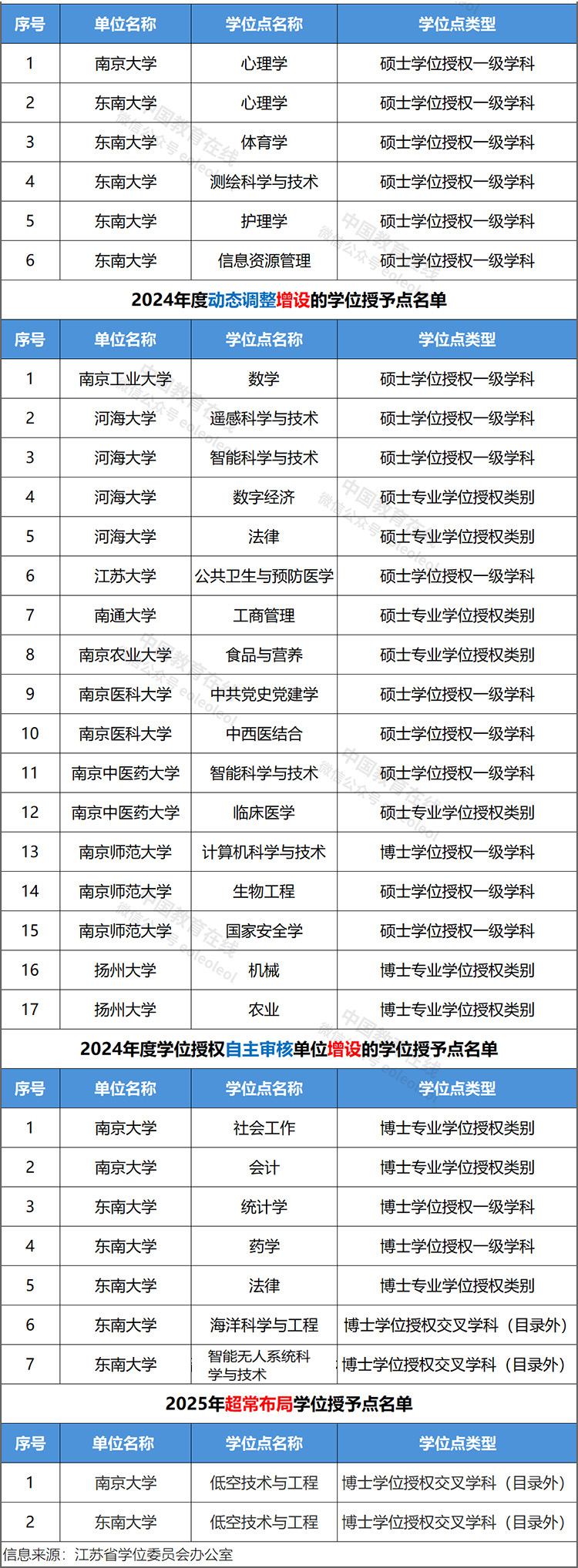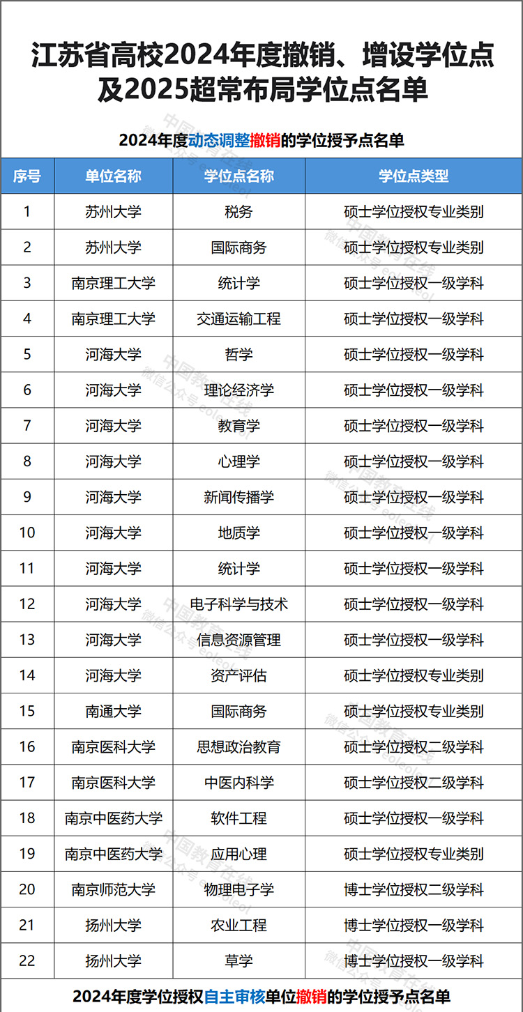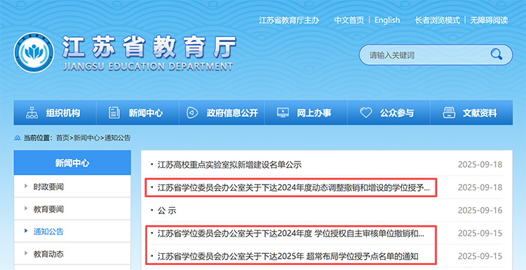 近日,江苏省学位委员会办公室公开《江苏省学位委员会办公室发布关于下达2024年度学位授权自主审核单位撤销和增设的学位授予点名单的通知》《江苏省学位委员会办公室关于下达2025年超常布局学位授予点名单的通知》《江苏省学位委员会办公室关于下达2024年度动态调整撤销和增设的学位授予点名单的通知》。