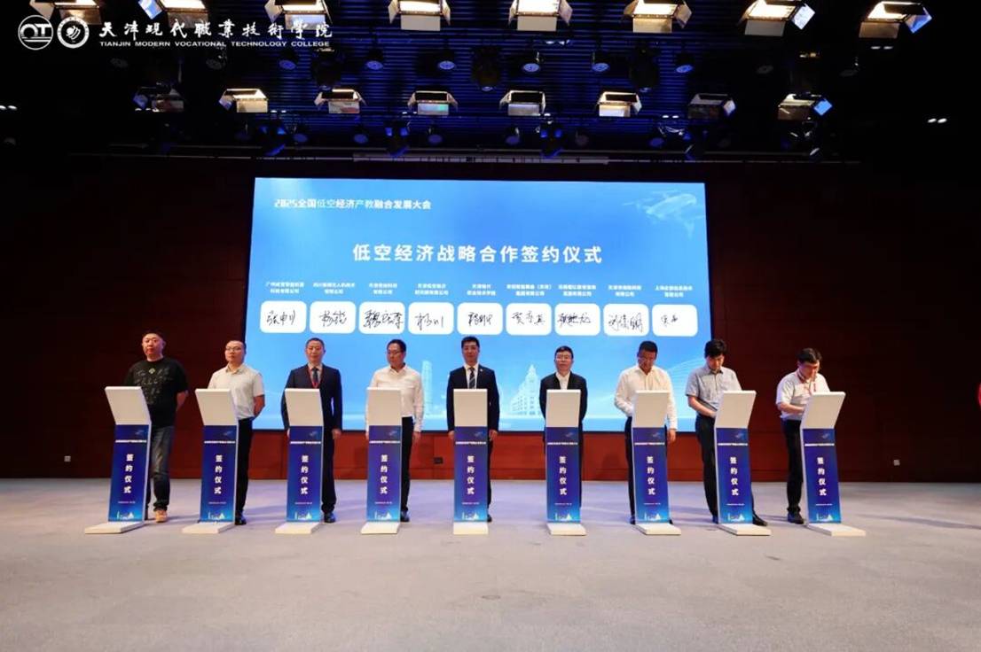 广州成至智能机器科技有限公司、四川纵横无人机技术有限公司、天津圣纳科技有限公司、天津低空经济研究院有限公司、天津现代职业技术学院、肯拓智能装备(天津)集团有限公司、云南载亿教育咨询发展有限公司、天津市诺联科技有限公司、上海企想信息技术有限公司等九家单位共同参与了低空经济战略合作签约仪式。