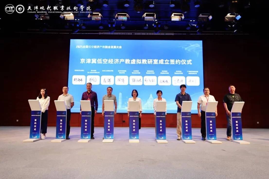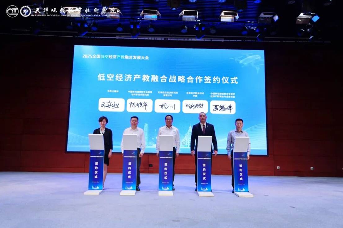中国移动通信联合会教育与科学技术研究院、中国移动通信联合会低空经济产教融合专业委员会、天津现代职业技术学院、天津低空经济研究院有限公司、中教全媒体等五家单位共同参与了低空经济产教融合战略合作签约仪式。