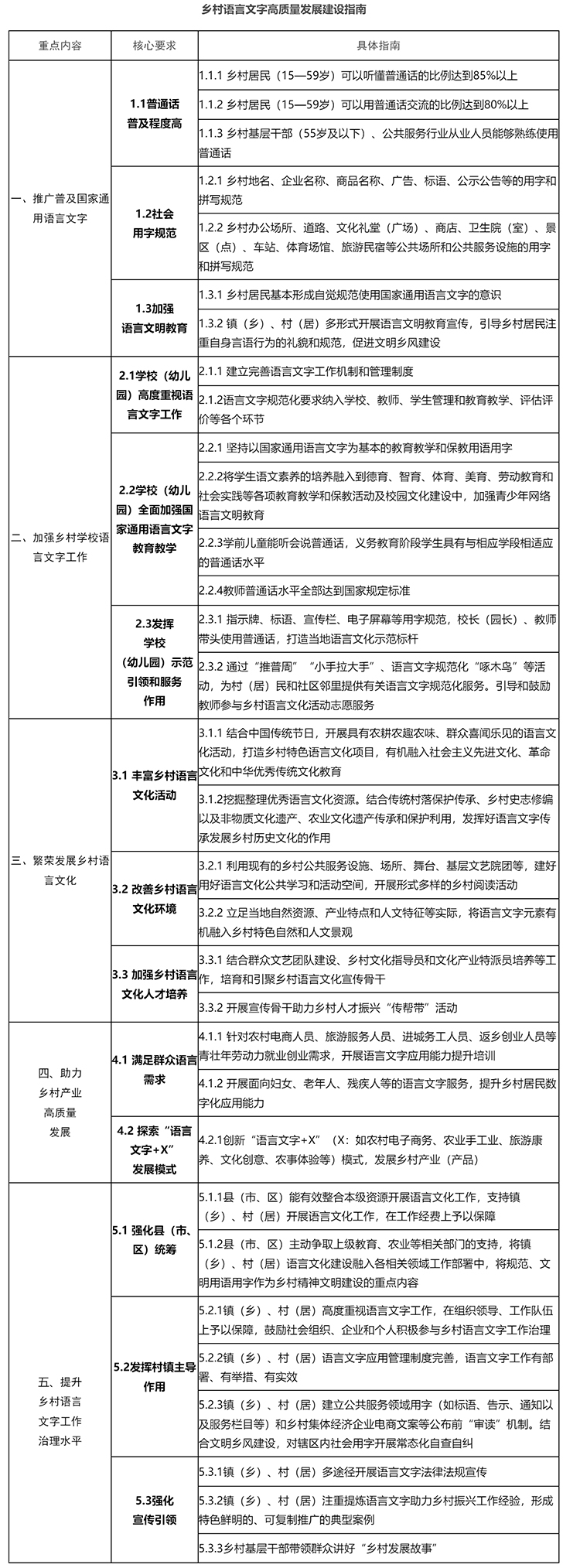 《乡村语言文字高质量发展建设指南》聚焦《教育强国建设规划纲要(2024—2035年)》提出的语言文字工作任务,明确了乡村语言文字工作“干什么”“怎么干”“谁来干”,为各地开展乡村语言文字工作提供了方向和指引。一是推广普及国家通用语言文字,包括普通话普及程度高、社会用字规范和加强语言文明教育三方面核心要求。二是加强乡村学校语言文字工作,要求学校(幼儿园)高度重视语言文字工作、全面加强国家通用语言文字教育教学、发挥示范引领和服务作用。三是繁荣发展乡村语言文化,包括丰富乡村语言文化活动、改善乡村语言文化环境、加强乡村语言文化人才培养等三方面核心要求。四是助力乡村产业高质量发展,提出满足群众语言需求、探索“语言文字+X”发展模式两方面核心要求。五是提升乡村语言文字工作治理水平,包括强化县(市、区)统筹、发挥村镇主导作用、强化宣传引领三方面核心要求。