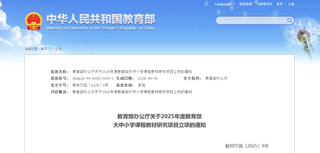 9月30日,教育部办公厅发布关于2025年度教育部大中小学课程教材研究项目立项的通知。