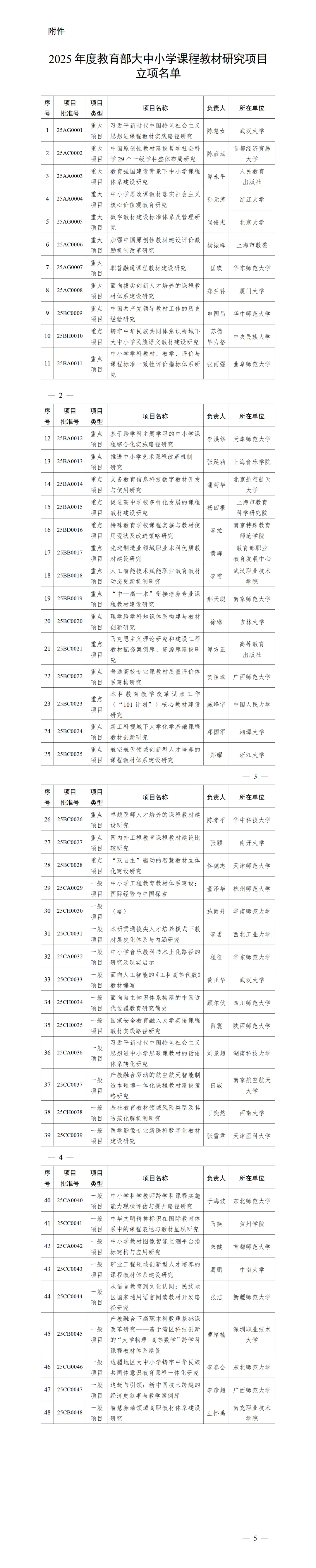 根据《教育部大中小学课程教材研究项目管理办法》(教材厅〔2025〕1号)和《教育部办公厅关于组织申报2025年度教育部大中小学课程教材研究项目的通知》(教材厅函〔2025〕7号),经组织申报、专家严格评审并面向社会公示,2025年度教育部大中小学课程教材研究项目共立项48项,现予以公布。各立项项目具体要求及安排由项目办公室另行通知。