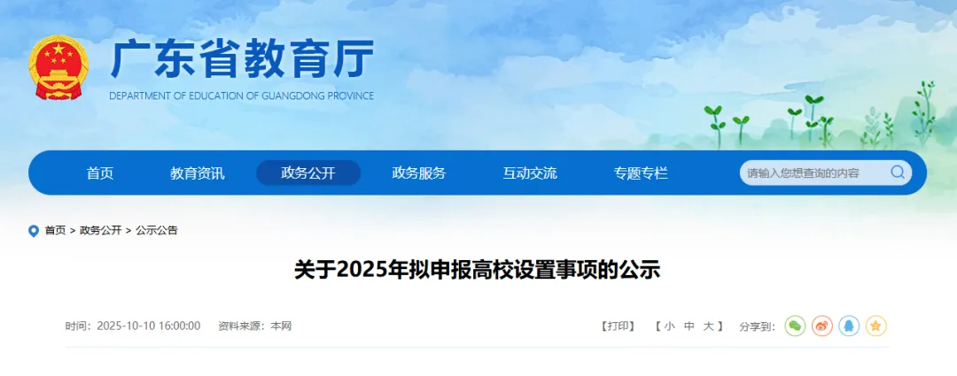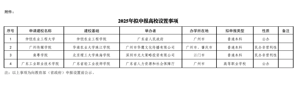 10月10日,广东省教育厅发布关于2025年拟申报高校设置事项的公示。对拟向教育部(省政府)申报的仲恺农业工程学院更名为仲恺农业工程大学华南农业大学珠江学院转设为广州传媒学院北京理工大学珠海学院转设为南粤学院、以广东省轻工业技师学院为基础设立广东工业职业技术学院等4个事项予以公示。