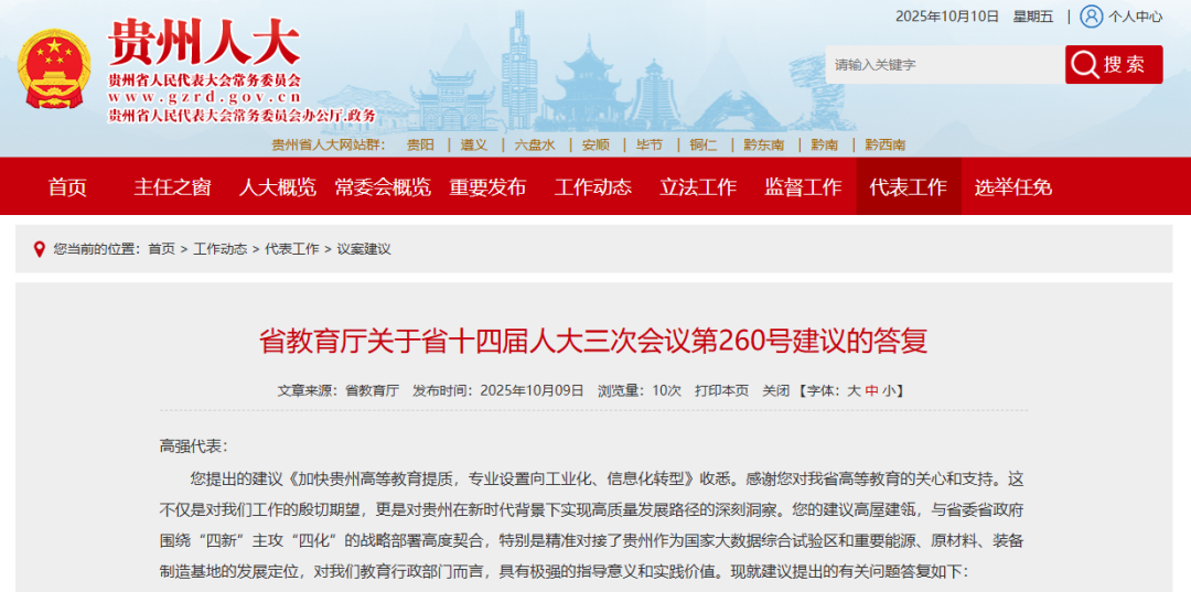 您提出的建议《加快贵州高等教育提质,专业设置向工业化、信息化转型》收悉。感谢您对我省高等教育的关心和支持。这不仅是对我们工作的殷切期望,更是对贵州在新时代背景下实现高质量发展路径的深刻洞察。您的建议高屋建瓴,与省委省政府围绕“四新”主攻“四化”的战略部署高度契合,特别是精准对接了贵州作为国家大数据综合试验区和重要能源、原材料、装备制造基地的发展定位,对我们教育行政部门而言,具有极强的指导意义和实践价值。现就建议提出的有关问题答复如下: