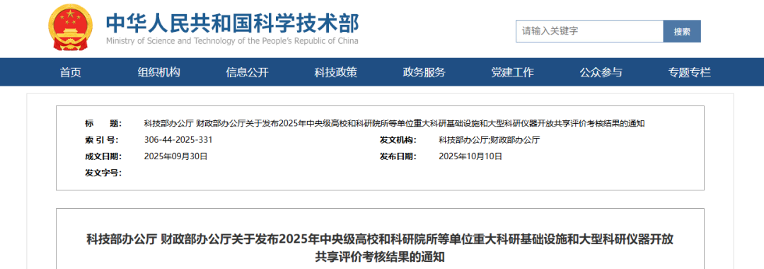 10月10日,科技部办公厅、财政部办公厅发布了《关于发布2025年中央级高校和科研院所等单位重大科研基础设施和大型科研仪器开放共享评价考核结果的通知》。