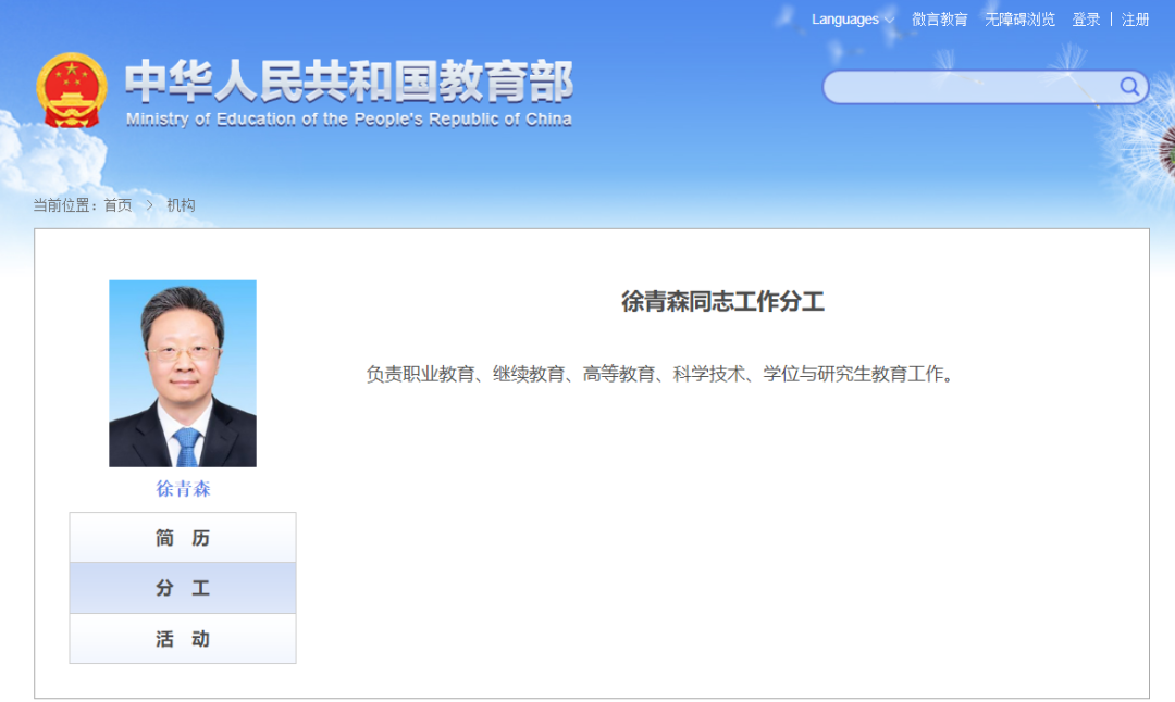 近日,教育部官网更新了教育部领导的分工,徐青森副部长分管职业教育、继续教育、高等教育、科学技术、学位与研究生教育工作。