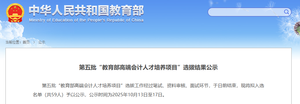 10月13日,教育部财务司发布第五批“教育部高端会计人才培养项目”选拔结果的公示。