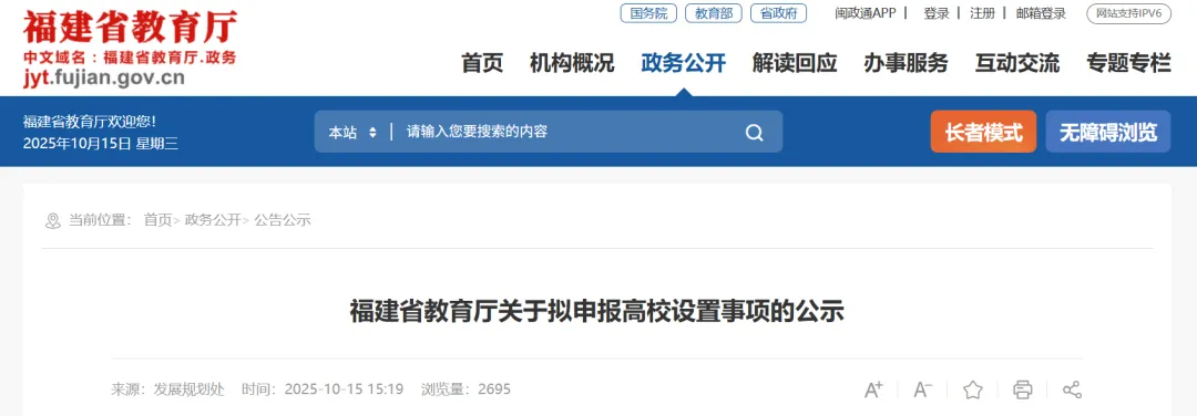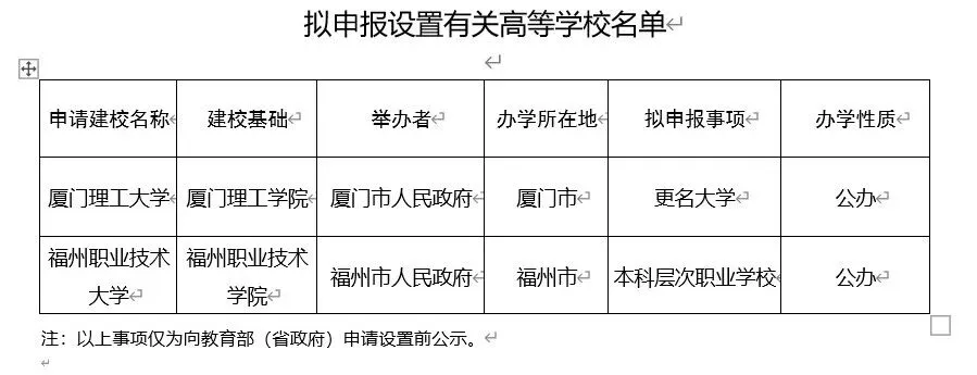 10月15日,福建省教育厅发布《关于拟申报高校设置事项的公示》,拟向教育部(省政府)申报厦门理工学院更名为厦门理工大学、在福州职业技术学院的基础上建立福州职业技术大学。