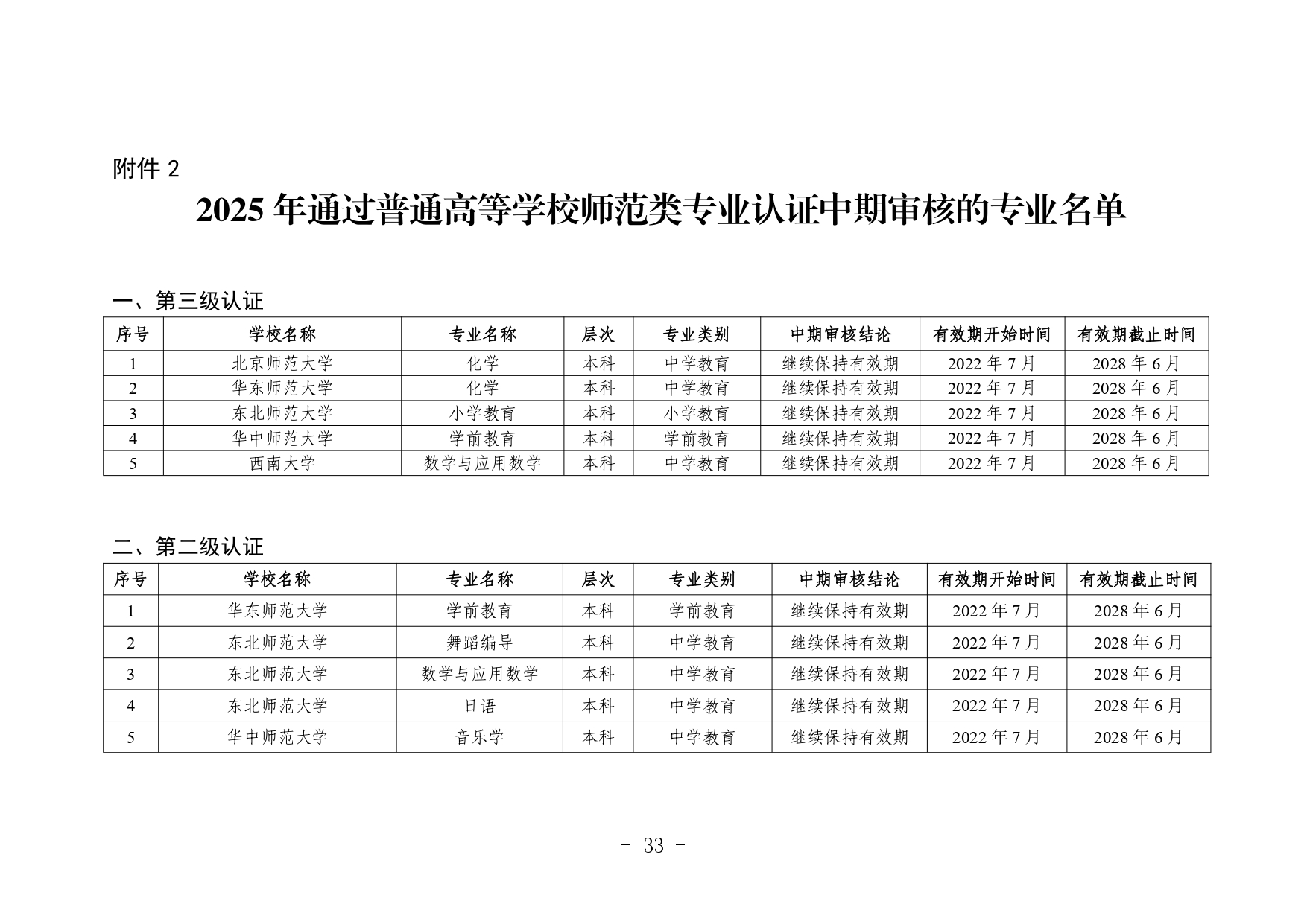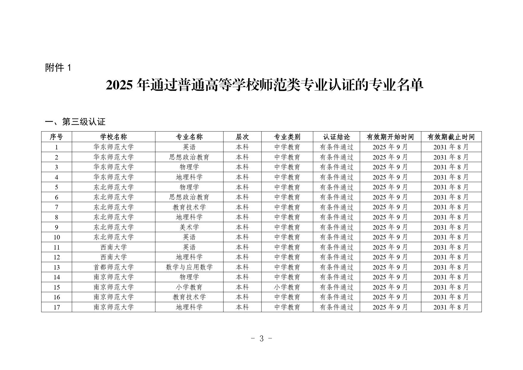 近日,教育部发布《教育部办公厅关于公布2025年通过普通高等学校师范类专业认证专业名单及中期审核专业名单的通知》,经高校申请、教育评估机构组织专家考查、普通高等学校师范类专业认证专家委员会审定,华东师范大学英语专业等17个专业通过第三级专业认证,中华女子学院学前教育专业等576个专业通过第二级专业认证,认证结论有效期六年,自2025年9月起至2031年8月止。经高校提交整改材料、专家审查、普通高等学校师范类专业认证专家委员会审定,北京师范大学化学专业等386个专业通过了师范类专业认证中期审核,继续保持原认证有效期。