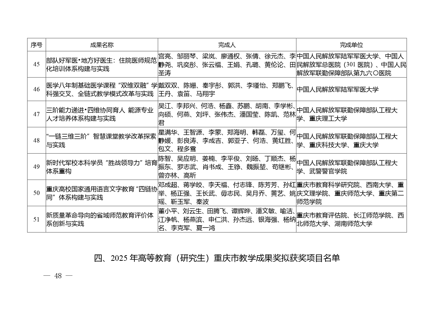 三、2025年高等教育(本科)重庆市教学成果奖拟获奖项目名单