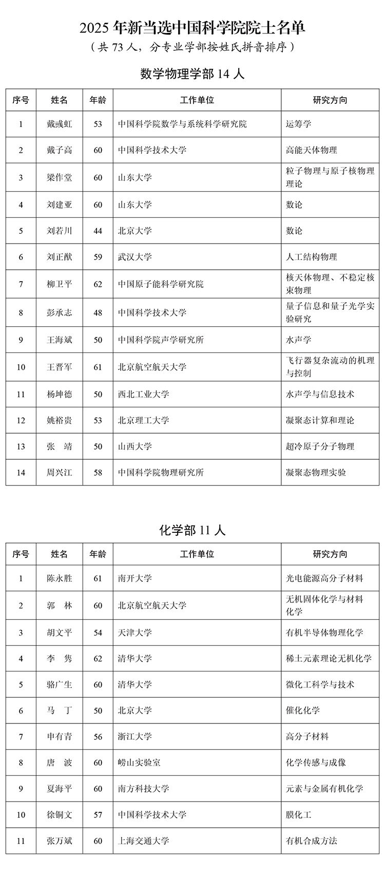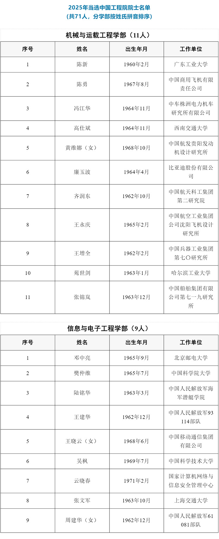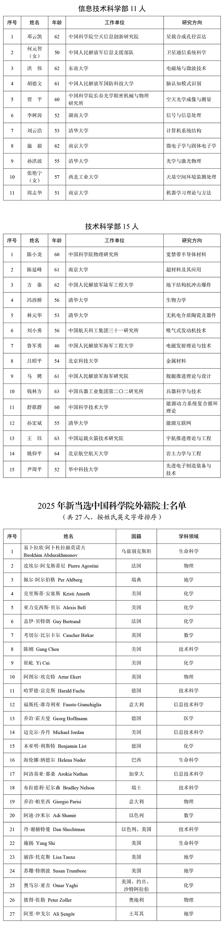 中国科学院、中国工程院11月21日公布2025年院士增选结果,分别选举产生中国科学院院士73人,中国工程院院士71人。