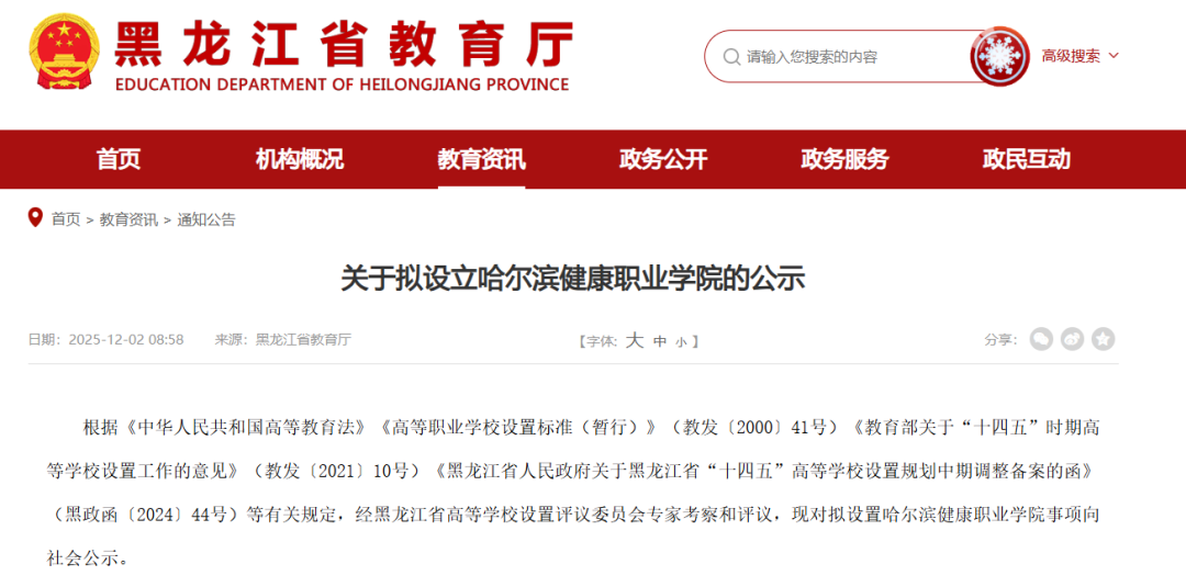 12月2日,黑龙江省教育厅发布《关于拟设立哈尔滨健康职业学院的公示》,根据有关规定,经黑龙江省高等学校设置评议委员会专家考察和评议,现对拟设置哈尔滨健康职业学院事项向社会公示。公示时间为2025年12月2日至8日。